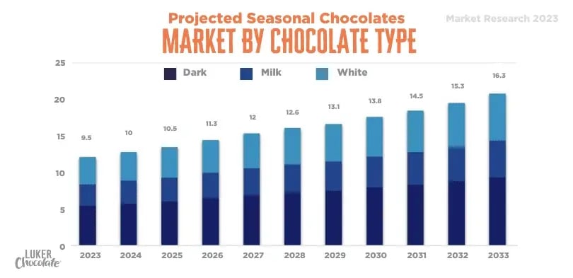 It's no secret each type of chocolate appeals to a different taste range and can be used in variable applications. All dark, milk, and white chocolate are present in all seasonal peaks. Nonetheless, changes in consumers' attitudes, according to the nature of the celebration, make certain preferences stand out.